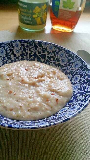 どろどろふわっとなるくらいまで5分混ぜます。 - 蜂蜜を加えて、シナモンをふり、かき混ぜてからシリアルボールに盛り付けます。